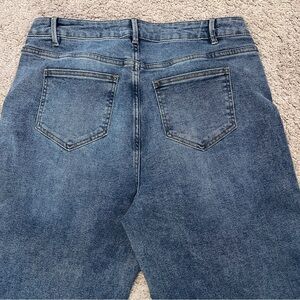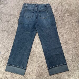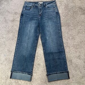 On-trend high-rise straight-leg jeans with front seam detail. Medium wash denim with cuffed hems for a modern, effortless look. Flattering fit with stretch— perfect for everyday wear.