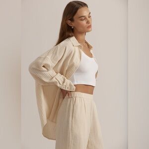 This set is AMAZING! Perfect for any occasion this season ahead, this is a staple for any closet! Selling as a SET ONLY, both are a size Large in the “Sand Stripe” which is a tan & white organic cotton gauze!