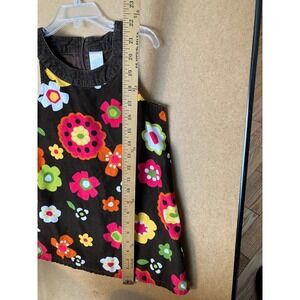 Gymboree brown corduroy a-line dress size 5. This sleeveless dress features a vibrant floral print with flowers in shades of pink, yellow, orange, green, and white. The dress has a corduroy collar and a zipper closure in the back. The fabric is 100% cotton.