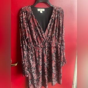 Beautiful Michael Kors paisley V-neck dress slight ruffle at waist and end of sleeves maroon and black perfect for any occasion extra special for Thanksgiving. The intricate pattern adds a touch of sophistication to your wardrobe. only worn once excellent condition.