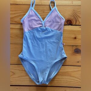 Elegant Yumiko Leotard with a pink top and gray bottom. Perfect for dance or casual wear. Soft and comfortable fabric.