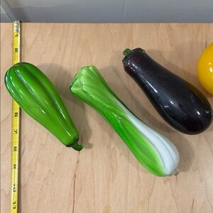 Vibrant faux vegetables in a wicker basket. Includes eggplant, bell peppers, and more. Perfect for decor.