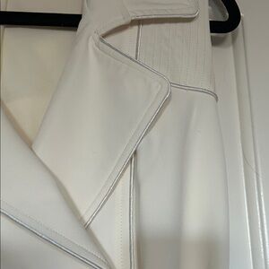 Stylish sleeveless trench coat dress in cream. Features a belted waist and double-breasted design. So versatile for all seasons! Cute with turtleneck or tee under or by itself. No wrinkle easy care. Get that sophisticated luxury look with this beauty. Lovely accent piping along the front and back. This is a capsule wardrobe piece that could also be worn as a vest. Classic never out of style!