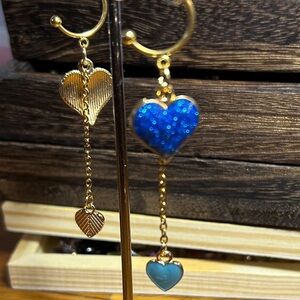 Elegant stainless steel gold tone hoop earrings featuring sparkling blue heart charms. Perfect for adding a touch of glamour to any outfit.