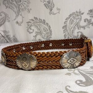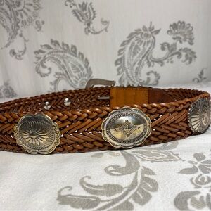 Stylish Fossil belt. Woven brown design. Silver buckle and accents. Perfect for any outfit.