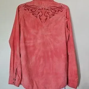 Wrangler Rock 47 shirt. Size medium. Stylish coral button-down with intricate embroidery. Features classic collar and front pockets. Beautiful detailing!
