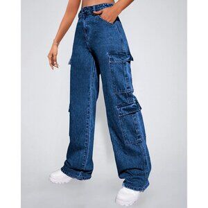 Women's High Waist Cargo Jeans Denim Wide Leg Flap Pocket Streetwear