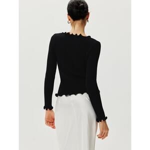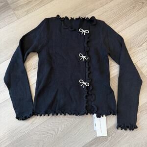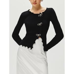 Add a touch of sparkle to your wardrobe with this adorable black stretch sweater! Featuring a delicate rhinestone bow detail and a charming lettuce trim, this sweater is perfect for adding a chic, girly flair to any outfit. The comfortable stretch fabric ensures a flattering fit, making it ideal for both casual and dressier occasions.