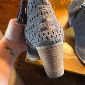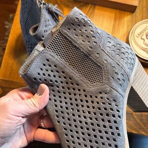 Chic light navy/grey ankle boots with a stylish cutout design. Features a comfortable block heel and peep-toe style.