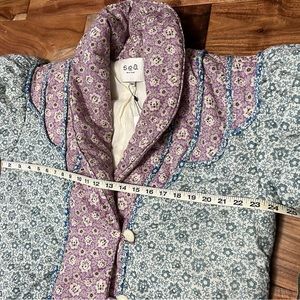 Chic puffer jacket with floral pattern. Features pastel blue and pink hues. Perfect for stylish warmth.