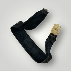Gorgeous art deco vintage leather belt, wide, black and with a gold colored statement buckle. In great pre-owned condition! Please see photos. Normal wear on the buckle considering its age, the leather is in excellent condition.