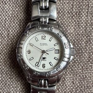 Details: Elegant Fossil watch featuring a silver bracelet and white dial. Ideal for everyday wear. Water-resistant 100M.