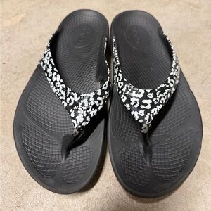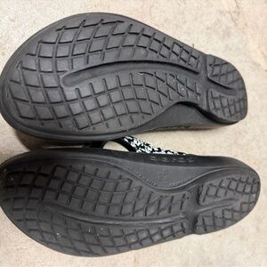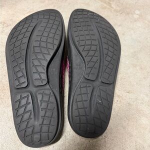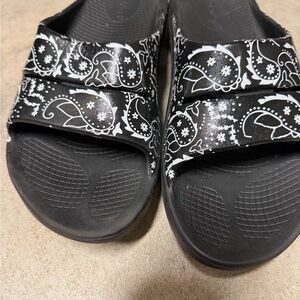Explore comfort with OOFOS sandals. Features black base with red, white, and tan accents. Ideal for casual wear. $100 for all 5 pairs or $25 each.