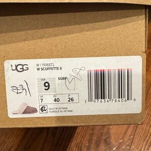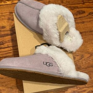 Soft and cozy slippers by UGG. Features plush cream sheepskin lining. Ideal for relaxation. Never worn. Comes with box. Light purple color