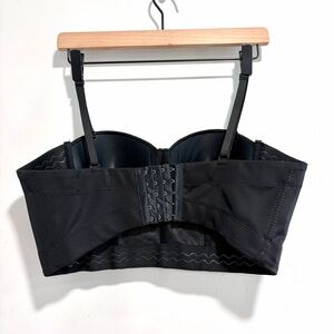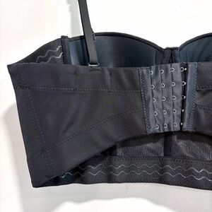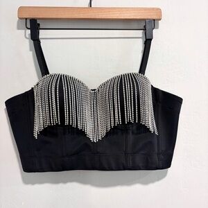 The Sang Women's Bustier Style Cropped Rhinestone Fringe Top in Black. Adjustable straps. Boning / structured. Stick sides to help stay in place. Adjustable back. Sewn in padded cups. Pre-owned in excellent condition - size large.