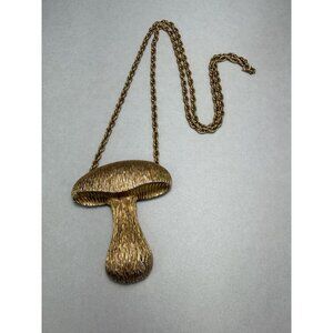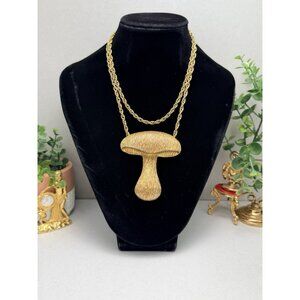vintage mushroom necklace, gold tone pendant necklace, statement necklace, sculptural jewelry, artistic pendant, organic design necklace, retro jewelry, vintage fashion accessory, bold pendant necklace, collectible jewelry, boho statement necklace