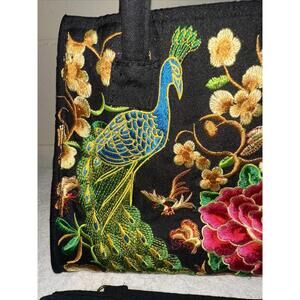 This Genuine Embroidered Vintage Tribal BOHO handbag tote bag is a unique and stylish accessory perfect for various occasions including travel, parties, casual outings, and workwear. The bag features all-over embroidery with birds and floral pattern, a zip closure, and double handles with gold hardware accents. Made from canvas and cotton, the exterior is multi-coloured with a exotic theme, while the interior includes inner pockets for organization. Handmade with a lightweight design, this shoulder bag by Trendi is a fashionable and functional choice for women who appreciate vintage style and quality craftsmanship.