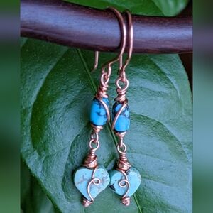 Authentic Turquoise Heart Earrings Copper Wire Wrap Dangle Drop