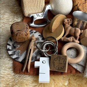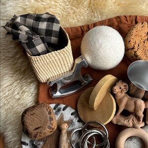Each kit that I list will be full of unique items…lovely enough, that even when scattered across the floor and being enjoyed, they are aesthetically beautiful and interesting to look at. As a way to move away from plastic and brightly colored toys, I focus on natural materials such as wood, leather, fur, silk, cashmere, wool etc. I love including uncommon objects, as well as familiar household items…things kids are drawn to. Every item has been thoroughly washed in natural soap/vinegar to make sure they are clean and ready for your little one. You will receive the exact set pictured, and every set will come in a reclaimed cotton bag to make it portable and easy to stow away. Please keep in mind that most of these items were not originally intended to be “toys”. I have chosen with safety in mind… But of course you know your child best and what you will feel comfortable allowing them to handle. As such, proceed with your own judgment. I’ll be listing new kits from time to time… So please keep an eye on my closet. Prices will depend on the size of each set and the items I’ve chosen to include.