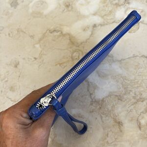 In excellent preowned condition with no signs of wear, Australian made wristlet wallet from Country Road. Made of fine full grain leather in a rich royal blue, it features a wrist strap, zippered top, lined interior with 4 credit card slots.
