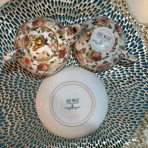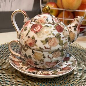 Charming floral teapot with matching cup and saucer. Features a beautiful rose pattern and gold accents.