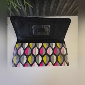 Bright, bold, and hard to find! This retired Vera Bradley Moon Drops tote and matching wallet set features a striking geometric teardrop / leaf pattern in black, pink, yellow, gray, and white. Lightweight yet structured with wipe-clean coated exterior — perfect for everyday, work, travel, or errands.