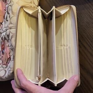 Coach purse with wallet and change purse not an exact match but goes very well together the change purse does have some kind of red stain on the yellow trim please see pictures .. flowers on the purse are a little dirty could use a cleaning not bad though