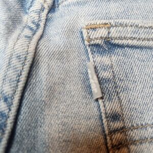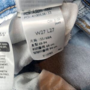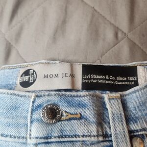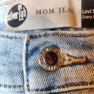 The product is a pair of Levi's Silver Tab women's jeans in a distressed, faded light wash denim. These Mom style jeans feature a zip and button closure, with a size 27 waist and 27-inch inseam. The denim fabric has a light wash and is accented with button and zipper detailing, as well as the Levi's logo. The jeans belong to the Levi's Silvertab product line and are designed for women in a regular fit with a vintage feel. EUC. no callouts