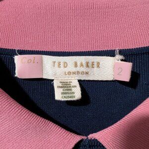 Add a touch of playful sophistication to your wardrobe with this "Origami" knit dress from Ted Baker's sought-after Colour by Numbers capsule collection. Designed as a chic casual daywear piece, it features a structured navy knit body, a preppy pink polo collar, and bold colorblock stripes at the hem in pink, white, and mint green.