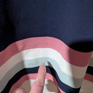 Please note: There is a faint, small spot on the white stripe near the hem (see close-up photos).
