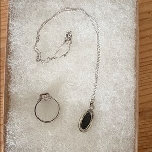 This elegant jewelry set features a stunning silver necklace and matching ring, both adorned with white accents. Perfect for adding a touch of sophistication to any outfit.