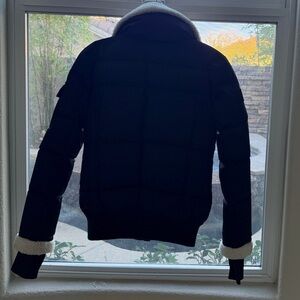 Elegant black puffer with cozy cream collar and cuffs. Ideal for cold weather.