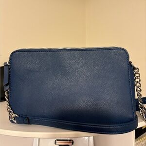 Elegant blue crossbody bag with sleek design. Features a stylish chain strap. Approx. size 10” x 7”x 2”