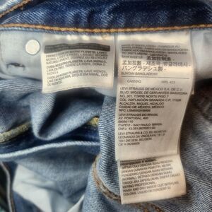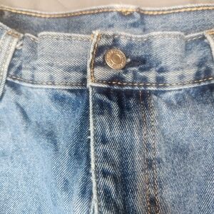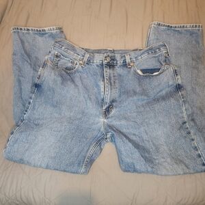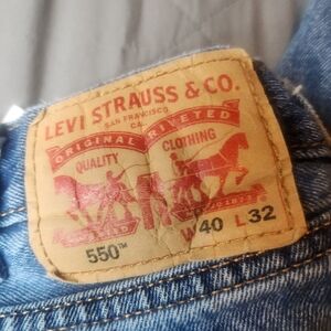 The product is a pair of vintage Levi's 550 jeans from the 90s with a medium wash and relaxed fit. These men's jeans feature a classic red tab, zip and button closure, straight leg style, and five pockets. The size is 40x32 inches, making them a comfortable and stylish option for those looking for a retro wardrobe piece with a timeless appeal. EUC. Minor wear from age
