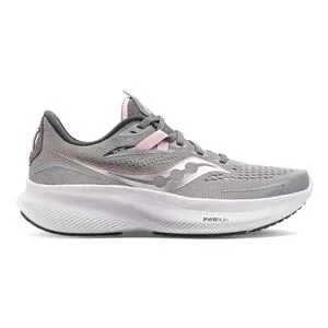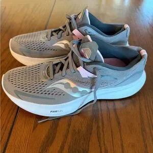 Stylish and supportive Saucony athletic shoes. Perfect for running and workouts. Sleek gray with pink accents.