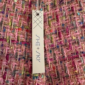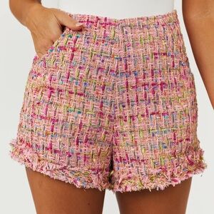 These chic high-waisted shorts from She + Sky feature a luxurious pink tweed fabric with a modern silhouette. The textured material and fringe detailing along the hem add a touch of sophistication to any outfit.