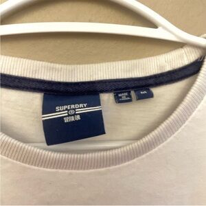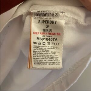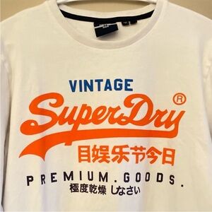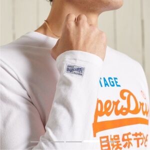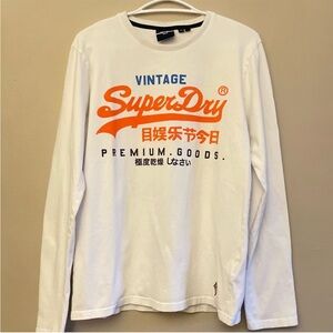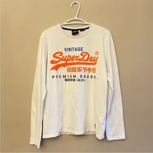 SuperDry white & orange graphic long-sleeve crewneck cotton tee, size medium, EUC. Classic fit with bold branding—perfect for casual streetwear or layered looks.