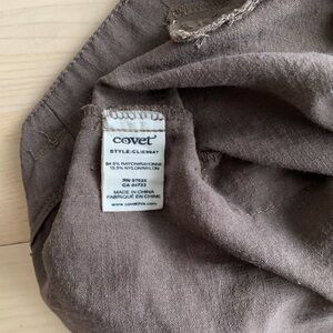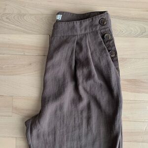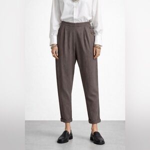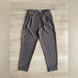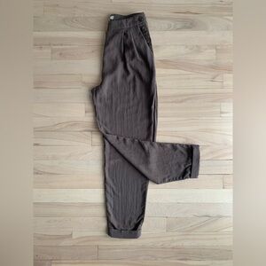 #covet, rayon trousers, high waisted, pleated pants, side button, minimalist, ssense style, lemaire, studio nicholson, modern vintage, tailored, tapered leg, neutral tones, contemporary, designer inspired, chic, effortless, slow fashion, understated, elevated basics