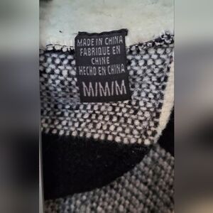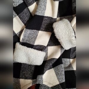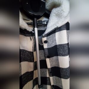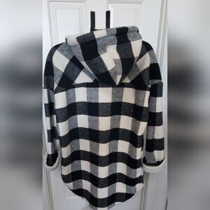 Stylish black and ivory plaid coat with a cozy hood. Perfect for chilly days.