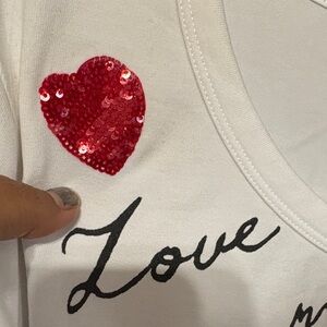White long-sleeve top with black script and red heart accents. Soft and comfortable fabric. Perfect for casual wear.