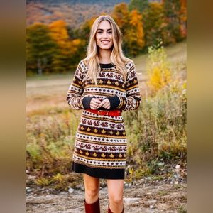 The most all-American, leaf falling, fire crackling, acorn popping, apple picking, pumpkin spicing, turkey roasting, eggnog nogging, coziest cabin, road trip tripping sweater dress of all. Prepare to hibernate.