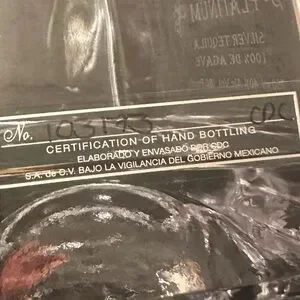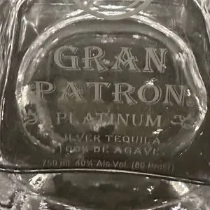 Elegant clear glass platinum gran Patron tequila bottle with a silver cap adds a touch of class to any bar. Perfect for collectors.