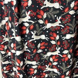 This awesome Penny jersey dress by BODEN is 100% cotton, there are two hip side seam pockets, the sleeves are three-quarter length, it is semi fitted with a boat deck and waist shaping pleats. The pattern is very cute, it has woodland bunnies, running through a field with a black background and red and white bunnies and florals. NWOT