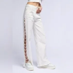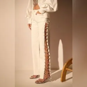 sz:W:25 /3 ✔️Elegant cream pants featuring side lacing. Ideal for a chic ensemble.Good Condition