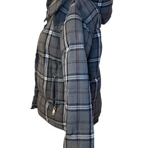 Plaid, Charcoal, grey, Vince Camuto puffy jacket puffer cozy hooded removable hood