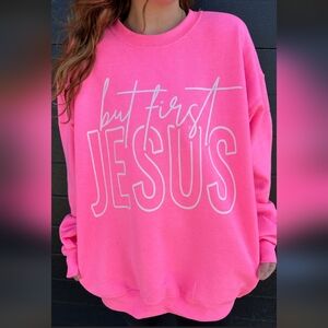 Wrap yourself in faith and fashion with this beautiful bright pink 'But First Jesus' Sweatshirt. This eye- catching graphic design combines spiritual devotion with contemporary style, creating the perfect statement piece for your casual wardrobe. Cozy enough for everyday wear while boldly expressing what matters most to you. A must-have addition that elevates both your outfit and your spirit.