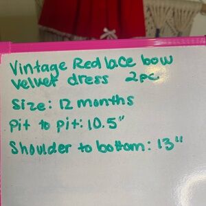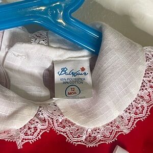 Adorable red baby dress with white lace and bow details. Perfect for special occasions.