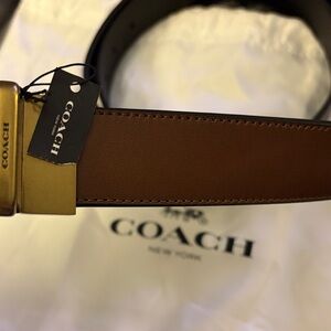 Stylish Coach men's belt in rich brown leather. Features a sleek gold buckle. Perfect for any outfit.