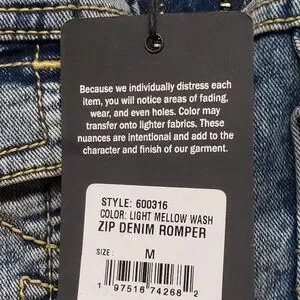 NWT True Religion Denim Short Zip Romper. Size M