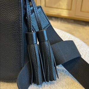 Stylish black crossbody bag with pebbled leather texture. Features a bold tassel and adjustable strap. Perfect for versatile wear.